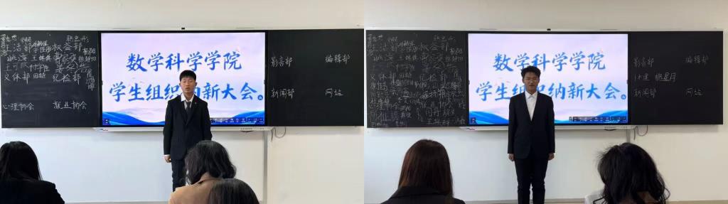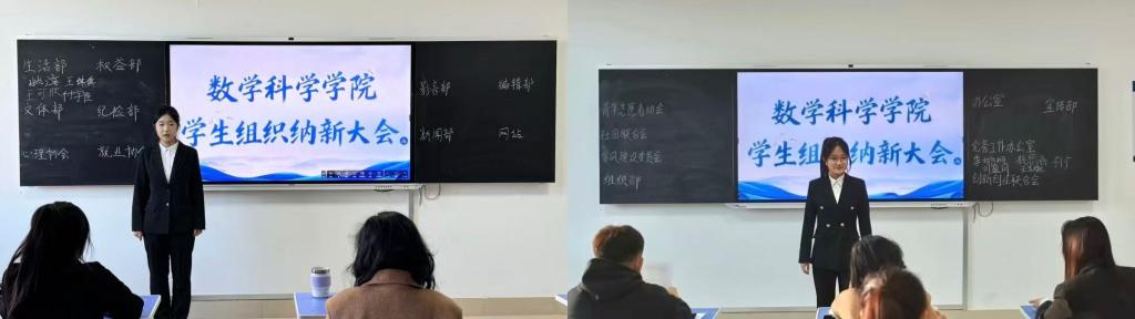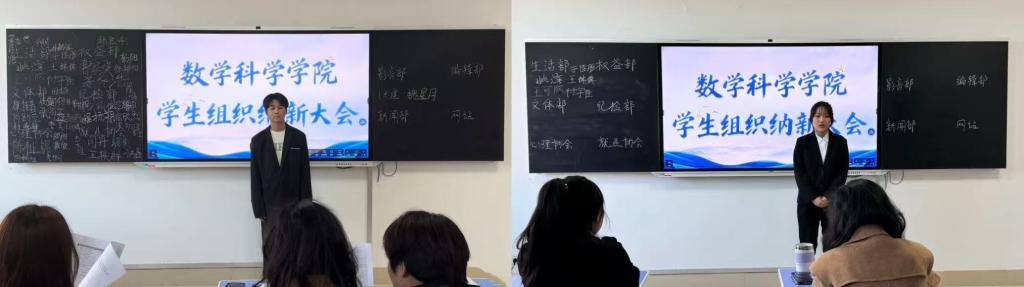 为进一步加强学生组织建设,搭建学生成长实践的优质平台,数学科学学院于10月22日、23日在学院205教室召开学生组织纳新大会。旨在通过汇聚新生力量,凝聚青春智慧助力学院发展。学生工作办公室主任夏丽娜、2024级辅导员于海洋、2025级辅导员闫炎,我院学生组织工作人员及部分有意愿竞选的学生参加。