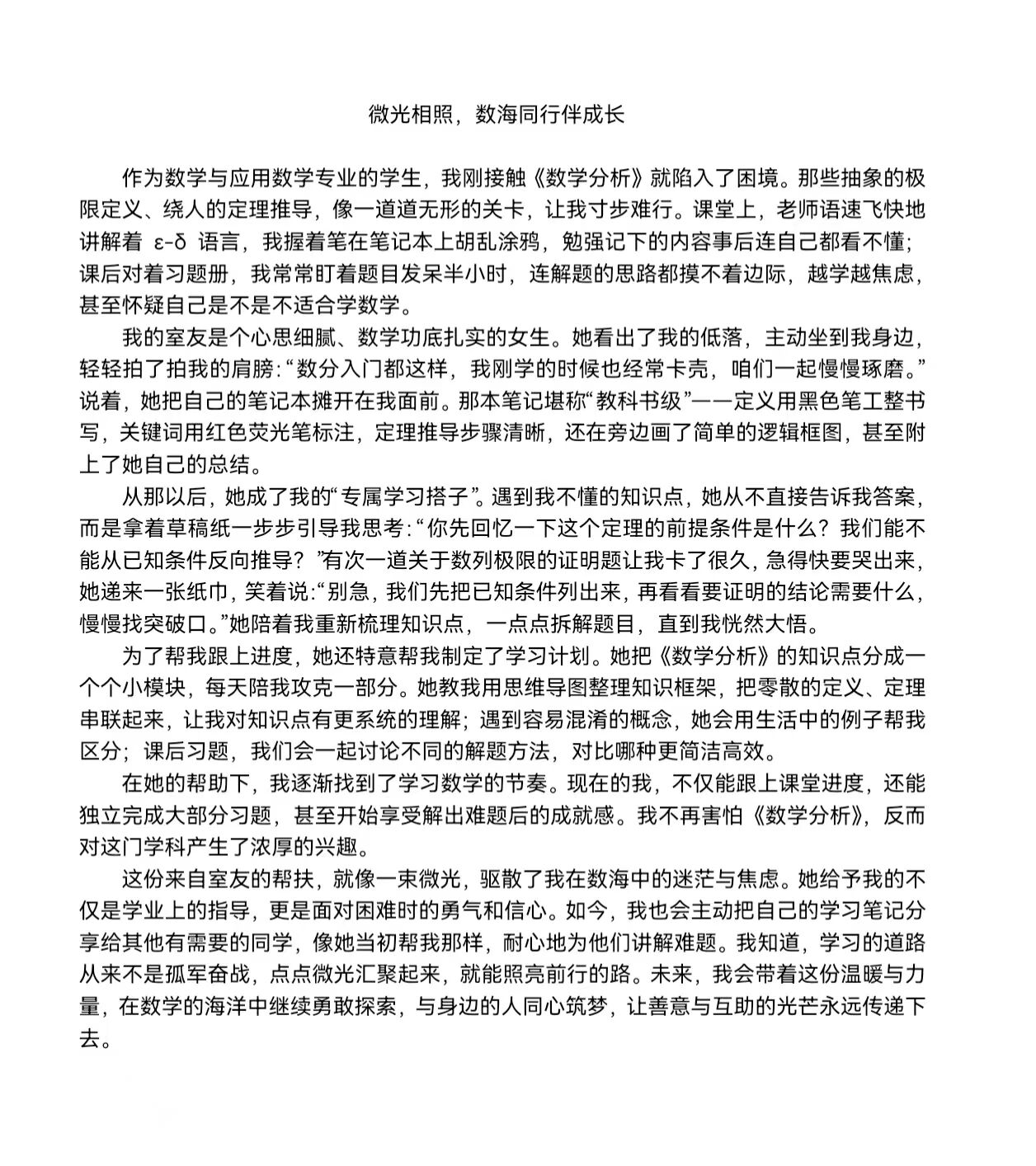 活动期间,同学们热情高涨、踊跃投稿,参赛作品以“帮扶”为核心,细腻书写寒冬暖阳般的困顿慰藉与灯塔指引式的人生启迪。作品中,既有同学间学业帮扶的暖心点滴,也有师生间心灵陪伴的温情瞬间,字里行间满含温暖与力量,既勾勒出个人成长轨迹,更将“微光相照”的互助精神具象化,生动展现同学们在善意传递中的共情共进。经评选,获奖名单及优秀征文代表作如下: