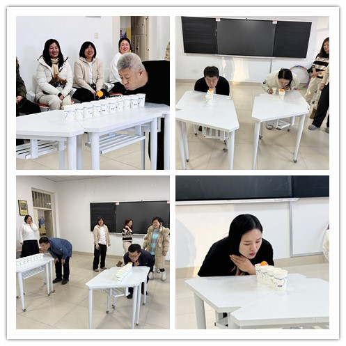 在“一圈到底”环节中,各组成员手拉手传递呼啦圈,考验团队协作与传递效率。老师们在实践中探索最优传递路径,将数学中的“最优化”思想生动融入游戏。“吹球过桥”环节则巧妙融入了物理与数学的结合。参赛老师需通过吹气控制乒乓球连续通过多个注水纸杯,既考验气息控制能力,也暗含了对流体力学与运动轨迹的直观理解。“眼疾手快”环节要求参与者在听到特定指令时迅速作出反应,抢夺面前的水瓶。这个游戏不仅考验反应速度,更体现了数学中的“概率思维”与“决策优化”,现场紧张刺激,充满欢乐。