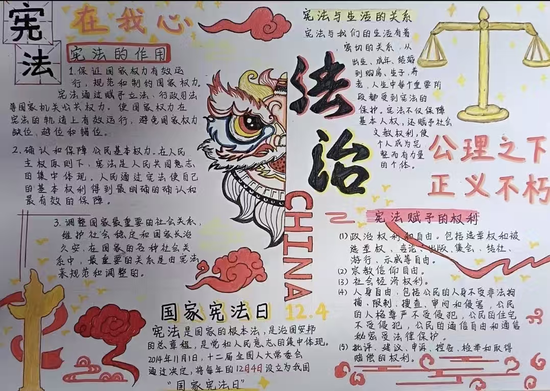 活动期间,学院同步开展“弘扬宪法精神,守护美好生活”主题作品征集活动,同学们踊跃参与,以手抄报、书法等多元形式融合宪法内涵与生活实践,用创意笔触定格法治信仰,在创作实践中主动研习宪法知识,将法治精神转化为思想自觉与行动自觉,营造了全员参与法治学习的浓厚氛围。