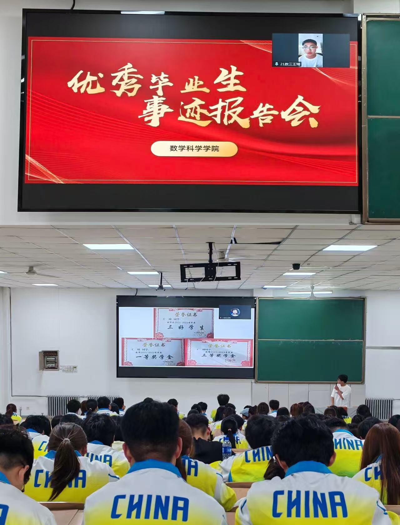 为充分发挥优秀毕业生的榜样引领作用,激发同学们的学习热情与奋斗动力。数学科学学院于6月16日在学院113教室开展“数海求知砺志,志愿献爱暖心”优秀毕业生事迹报告会,2024级全体学生参会,21级优秀毕业生王琦以线上形式,向学弟学妹们分享自己的奋斗历程与成长经验,传递榜样力量。