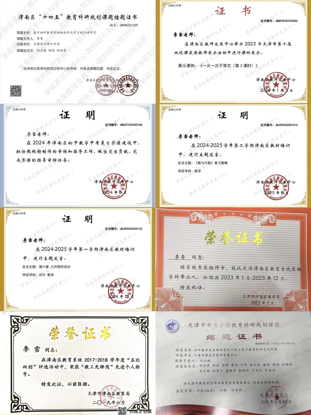 在教育上,李雪坚持“德育居首”,用爱心与智慧陪伴学生成长,所带班级两获区级“三好班集体”,她本人也获评津南区“中考优秀班主任”。教学中,她苦练基本功,9次教材教法考试居全区前三分之一,2019年成为“津南区初中数学学科带头人”,入选区级名师工作室,执教的课例多次获市级、区级奖项,还13次为全区教师做教材分析。科研上,她聚焦课堂实效,多篇论文获奖,主持并参与多项市、区级课题,担任教研组长时带领团队获评“区级先进教研组”,更以“传帮带”精神指导青年教师成长,在爱心与智慧的付出中收获丰硕成果。