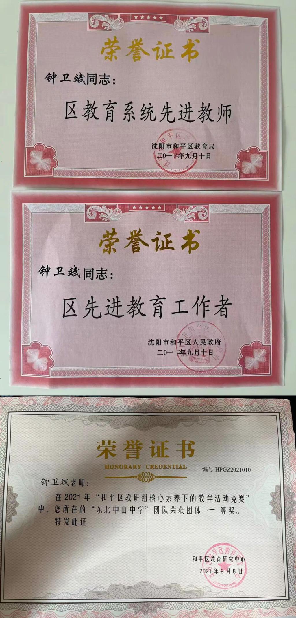 2013年,钟卫斌入职东北中山中学,正式开启数学教学生涯。他迅速将理论与实践结合,在教学竞赛中崭露头角——入职首年便获“沈阳市说课大赛一等奖”,此后接连斩获“全国优质教育成果二等奖”、“区教研组教学活动竞赛一等奖”等多项荣誉。十余年来,他深耕教学一线,先后被评为“区教育系统先进教师”、“区先进教育工作者”,用严谨的教学态度与出色的课堂效果,赢得学生与同事的广泛认可。