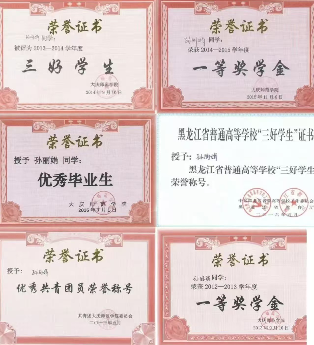 收到大学录取通知书的那一刻,她的心中满是对教育事业的憧憬。她深知,“三尺讲台”不仅是梦想的起点,更是一份沉甸甸的责任。在校期间,她不仅连续四年担任班级学习委员,获评“三好学生”荣誉称号,更凭借优异成绩多次斩获校级奖学金,并荣获“国家励志奖学金”。本科毕业时,“黑龙江省普通高等学校三好学生”“优秀学生干部” 等荣誉,是她给母校最好的答卷。