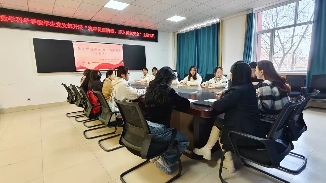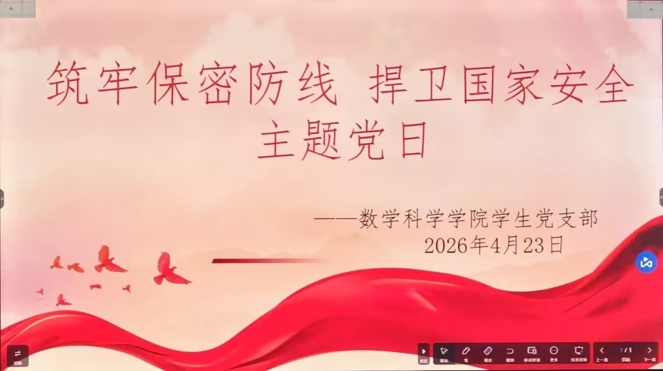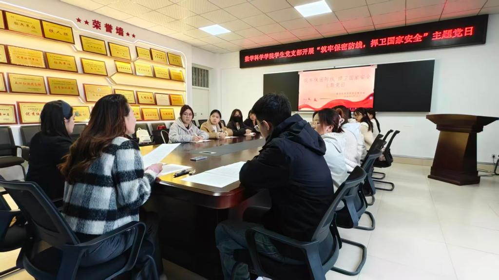 为深入学习贯彻总体国家安全观,强化全体党员国家安全意识与保密观念,筑牢维护国家秘密安全的思想防线,切实提升党员防范化解安全风险的政治自觉与行动自觉,数学科学学院学生党支部于4月23日在计算机楼216教室开展“筑牢保密防线,捍卫国家安全”主题党日活动。学生党支部书记夏丽娜、宣传委员兼纪检委员张鹭、组织委员于海洋、辅导员闫炎及全体学生党员共同参会。